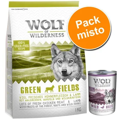 Por tempo limitado! Experimente já este pack misto de Wolf of Wilderness com 1 kg de ração Green Fields com cordeiro + 6 latas de 400 g de comida húmida Wild Hills com pato, a um preço especial!
