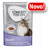 Concept for Life é um alimento completo de qualidade para gatos adultos de todas as raças, disponível nas quantidades seguintes: 400 g, 3 kg e 10 kg. A variante de 9 kg é composta por 3 embalagens de 3 kg.